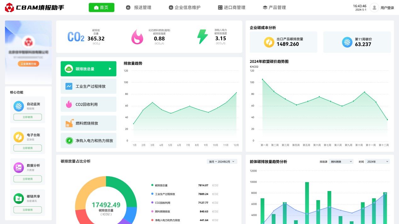 2023年10月1日起,歐盟碳邊境調整機制(CBAM)已進入過渡期,CBAM涵蓋范圍的出口產品需按時提交產品碳排放報告,未提交報告的企業(yè)將面臨高額處罰。為解決企業(yè)由于官方政策文件理解難度大,專業(yè)門檻高,數據搜集難度大,部分數據缺失無法填等困擾,推出碳關稅管理平臺(CBAM填報助手),通過數字化方式,為企業(yè)提供碳數據填報、碳數據核算、碳數據報送、碳數據認證、咨詢培訓等全流程服務。可極大減少企業(yè)碳排放報送門檻,助力企業(yè)低成本合規(guī)報送碳排放數據。